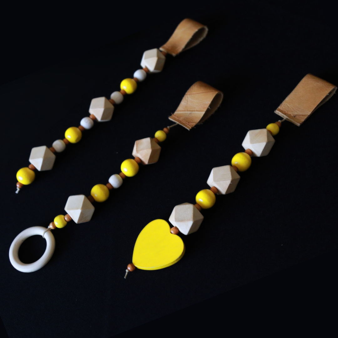 Our hand-assembled beaded dangle toys are thoughtfully crafted from smooth, natural wooden beads to engage your baby's senses and encourage tactile exploration in a safe and gentle way. The beads offer a delightful mix of textures and shapes that promote sensory development while being durable and non-toxic. Complimenting the natural wood, leather straps made from off-cuts to support our sustainability and zero-waste philosophy-help keep the toys in place during active play. These eco-friendly materials ensure peace of mind, making the toys both stimulating and responsibly made. Perfect for pairing with our Wooden Framed Baby Gyms for engaging back and tummy time, or as a stylish addition to any baby gym or nursery decor.